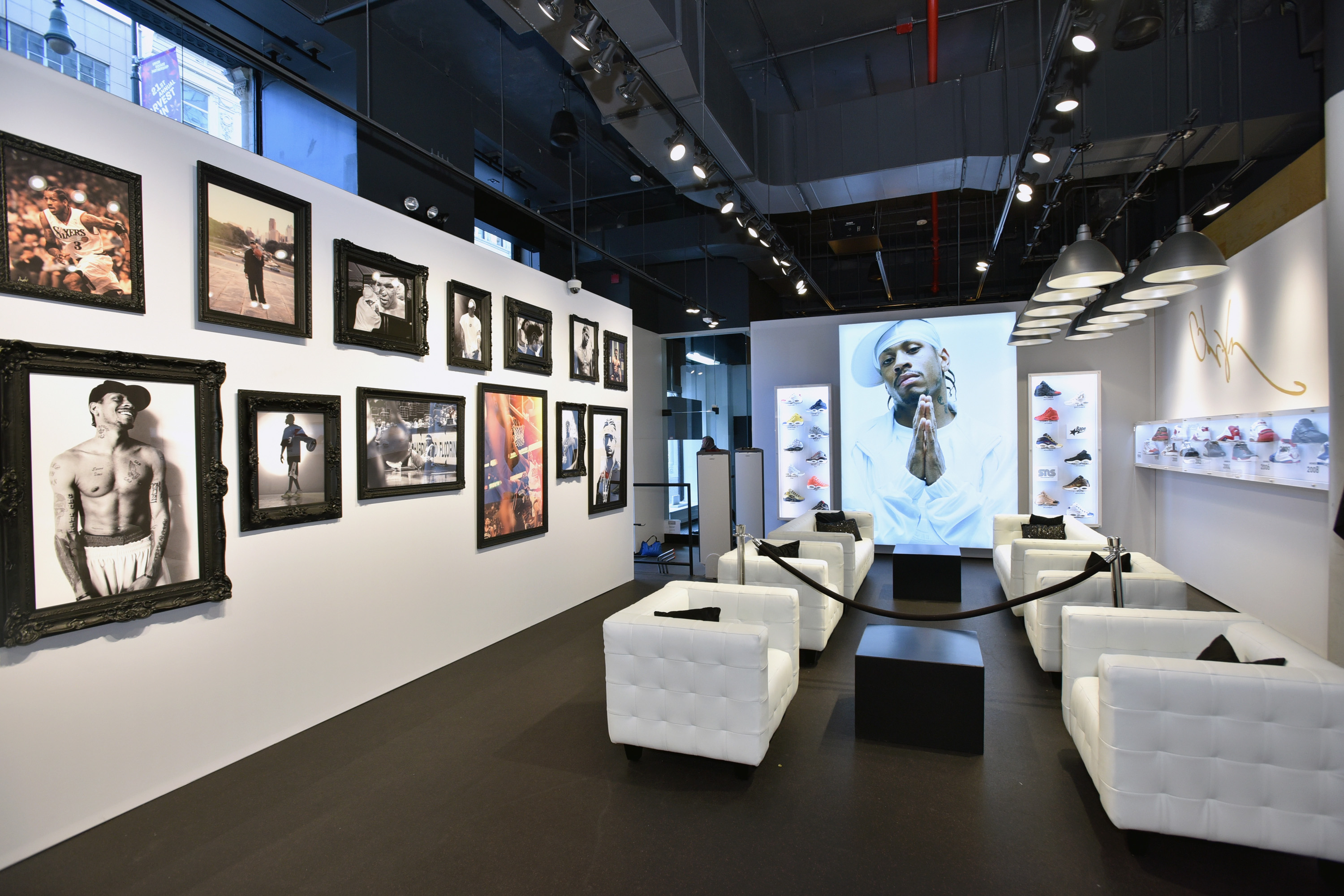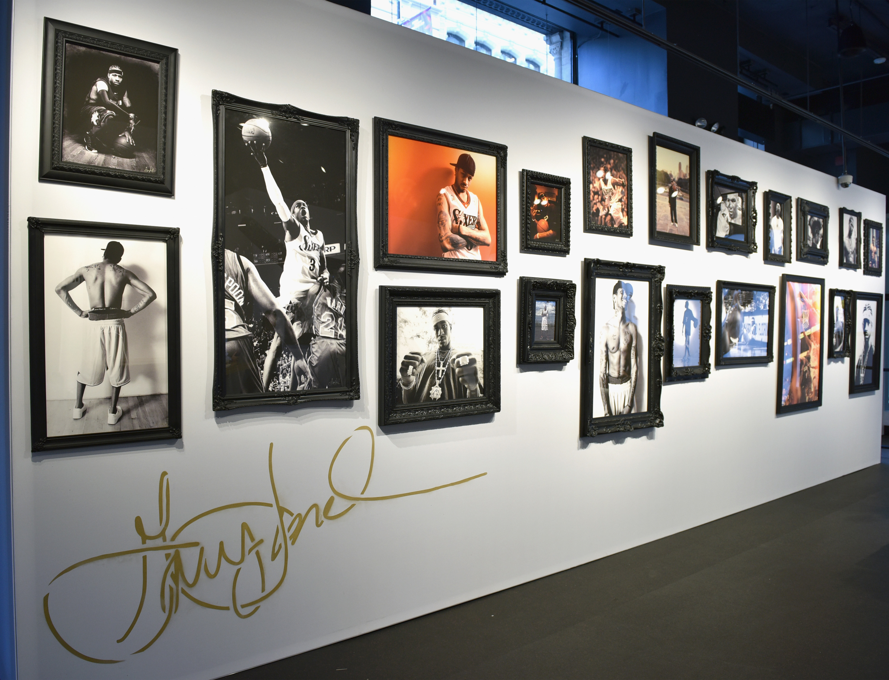 A Celebration Of Allen Iverson / Question Launch: Conceptual Design. In-house Team 2016. Some events are small and intimate. We were asked to create a new skin over an existing location in celebration of the 20th anniversary of Allen Iverson’s iconic Question Mid shoe. The idea was to create a neutral space where art and selected product could shine. A simple gallery feel was established in order to allow guests the space to mingle while viewing photography taken of the player over the years by photographer Gary Land. Rare archival product was displayed via a timeline so the evolution of the Classic shoe can be seen.