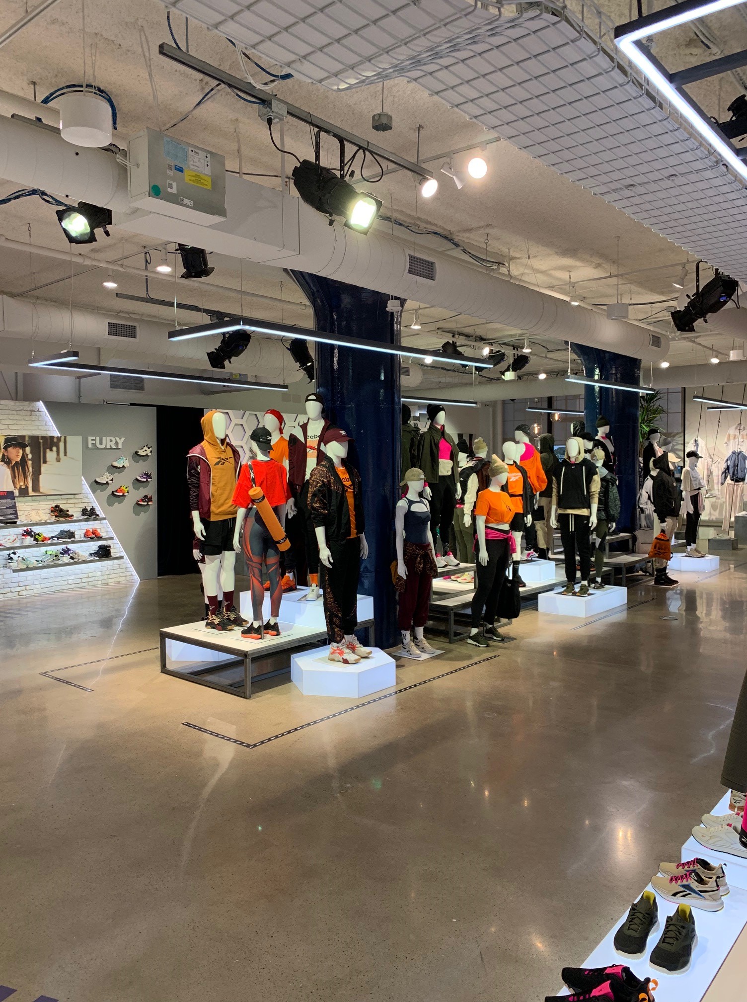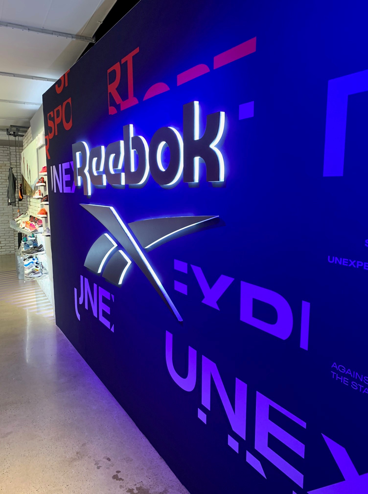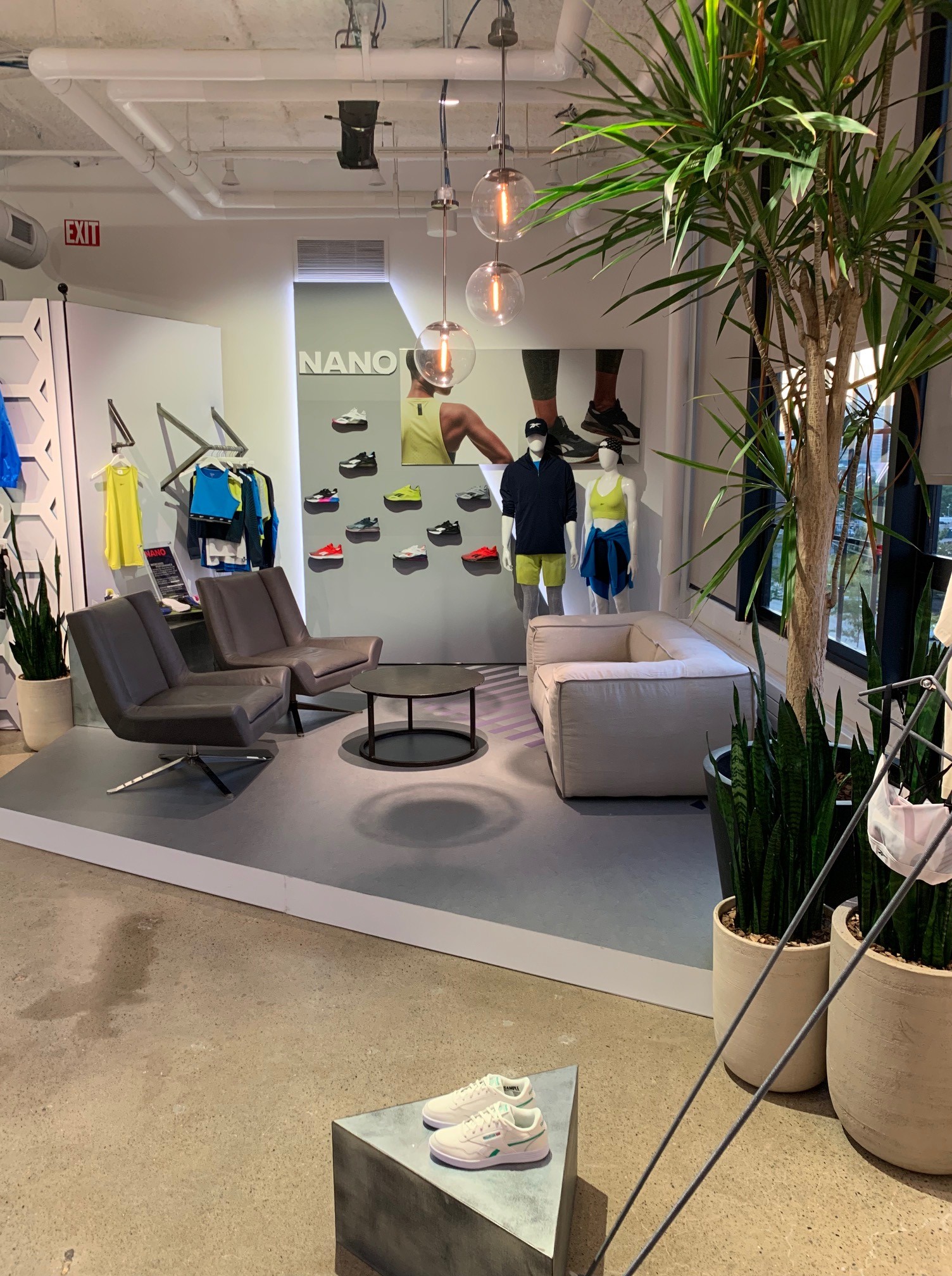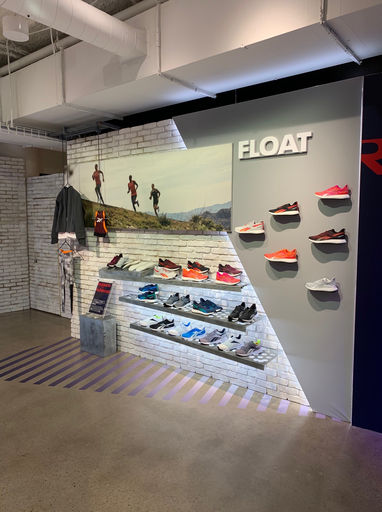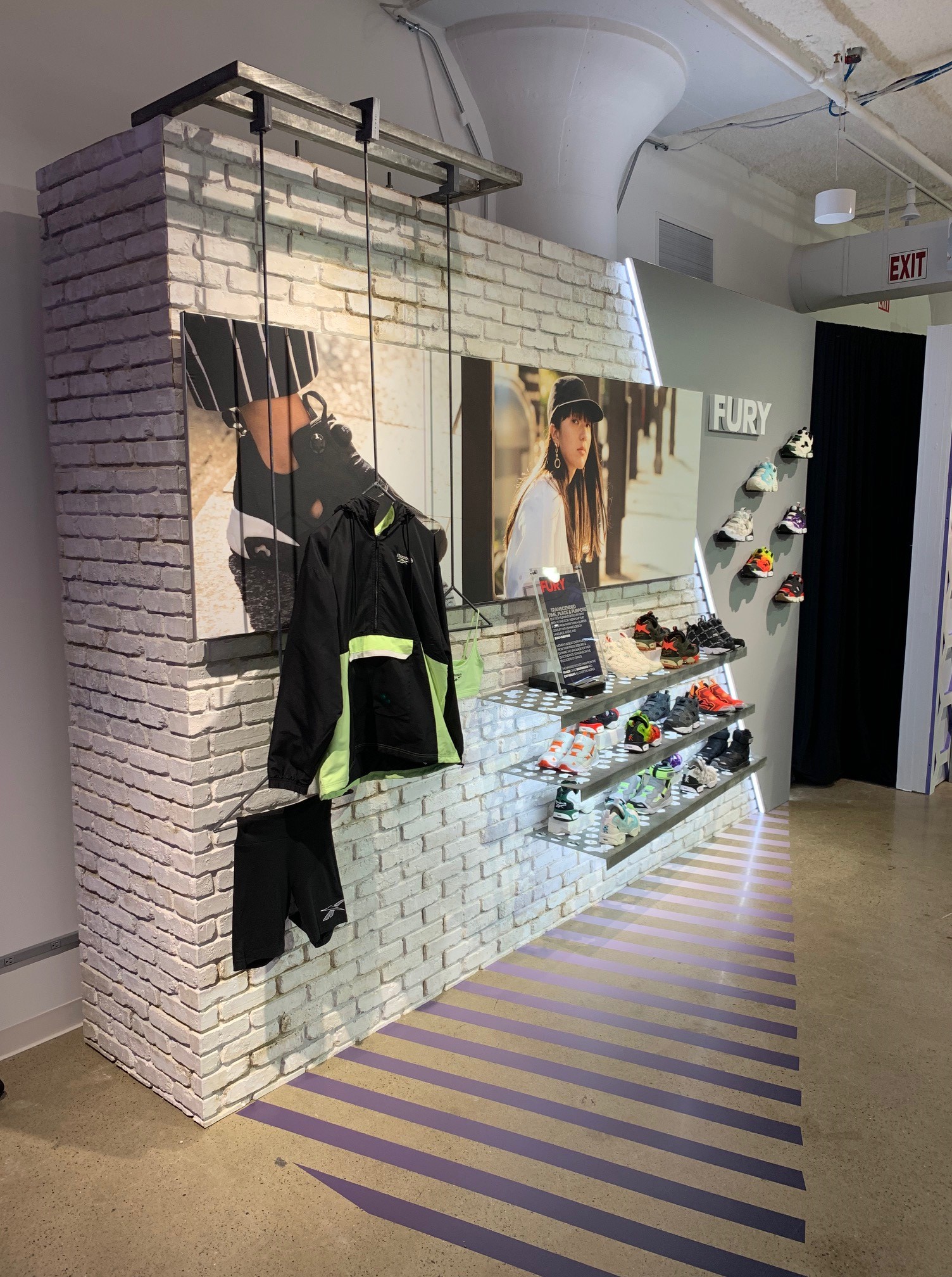 The Gallery, Reebok Headquarters, Boston: Conceptual Design. In-house team 2018. The purpose of this space is to present the Brand’s product Icons in consolidated stories in head-to-toe hook up styling. The space was in constant flux in order to stay fresh. The display walls utilized stretch graphics in order to easily change the feel of the space. Furthering the aspect of modularity, we employed magnetic fixtures over the stretch graphics to showcase a single piece of product or massed out if needed.