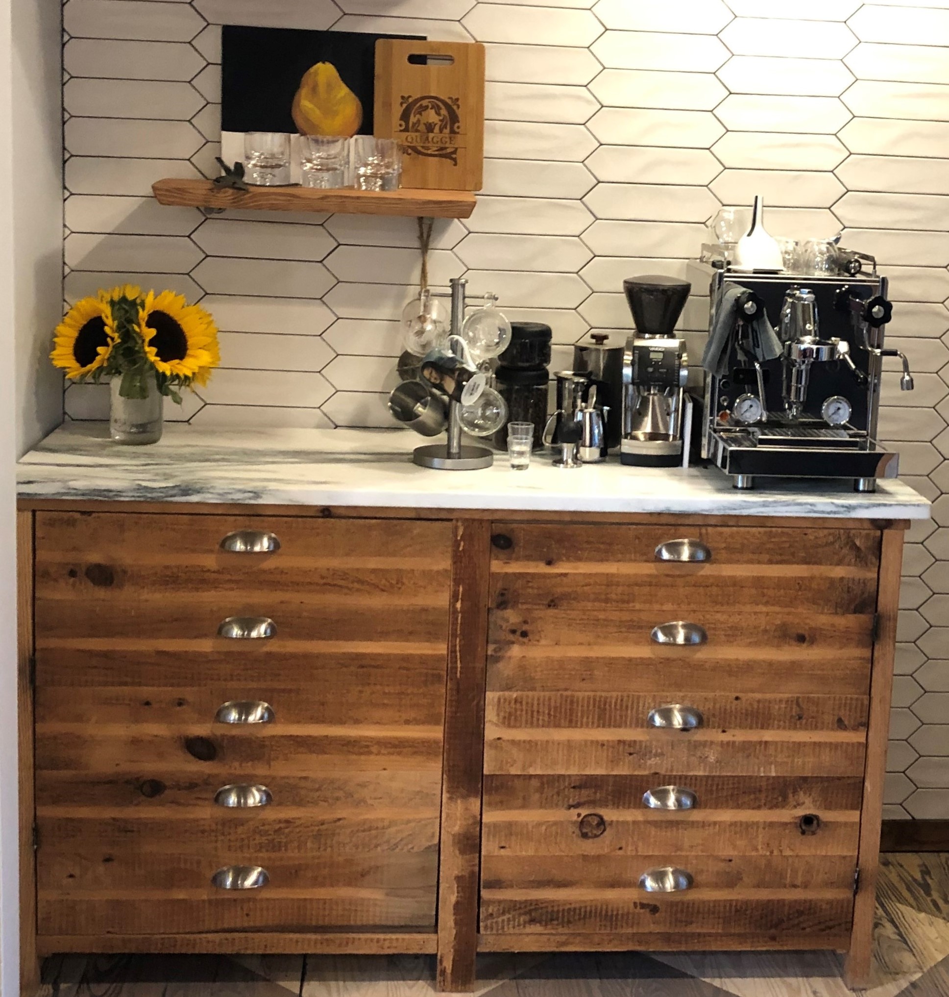 Hand drawn and hand crafted with disciplines in furniture, stained glass, copperwork, leatherwork, and stonework. A focus on careful curation of wood species, metal luster, glass color and texture, leather and stone veining which ensures form and function to deliver an elevated design aesthetic.